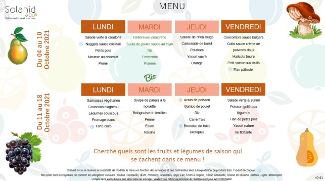 La réservation pour les repas de cantine se fait au plus tard le lundi pour la semaine suivante, soit auprès de Françoise, soit auprès du secrétariat de mairie. Vous pouvez voir à gauche un exemple de menus proposés à la cantine scolaire.