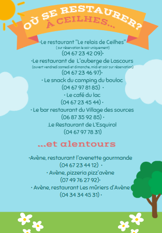 Le café du lac propose des moments de convivialité autour d’un café, d’une salade ou encore d’une pizza. Vous y retrouverez une belle vue sur le lac de Ceilhes ainsi que de multiples activités tel qu’un billard et un mini-golf. Contact : 04 67 23 45 44